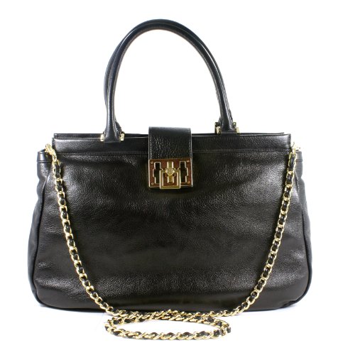 This gorgeous Eleri Satchel is the impressive Tory Burch handbag you are looking for. A large classic satchel silhouette with Tory Burch signature detailing. The front clasp is a gold tone and wood inlay turnlock with a Tory Burch logo center. Rolled top handles with enough of a strap drop to fit over the shoulder (8 inches). Also a removable chain link and leather shoulder strap which adds a bit Tory Burch Eleri Satchel Black Leather Large Handbag ... Buy from amazon.com